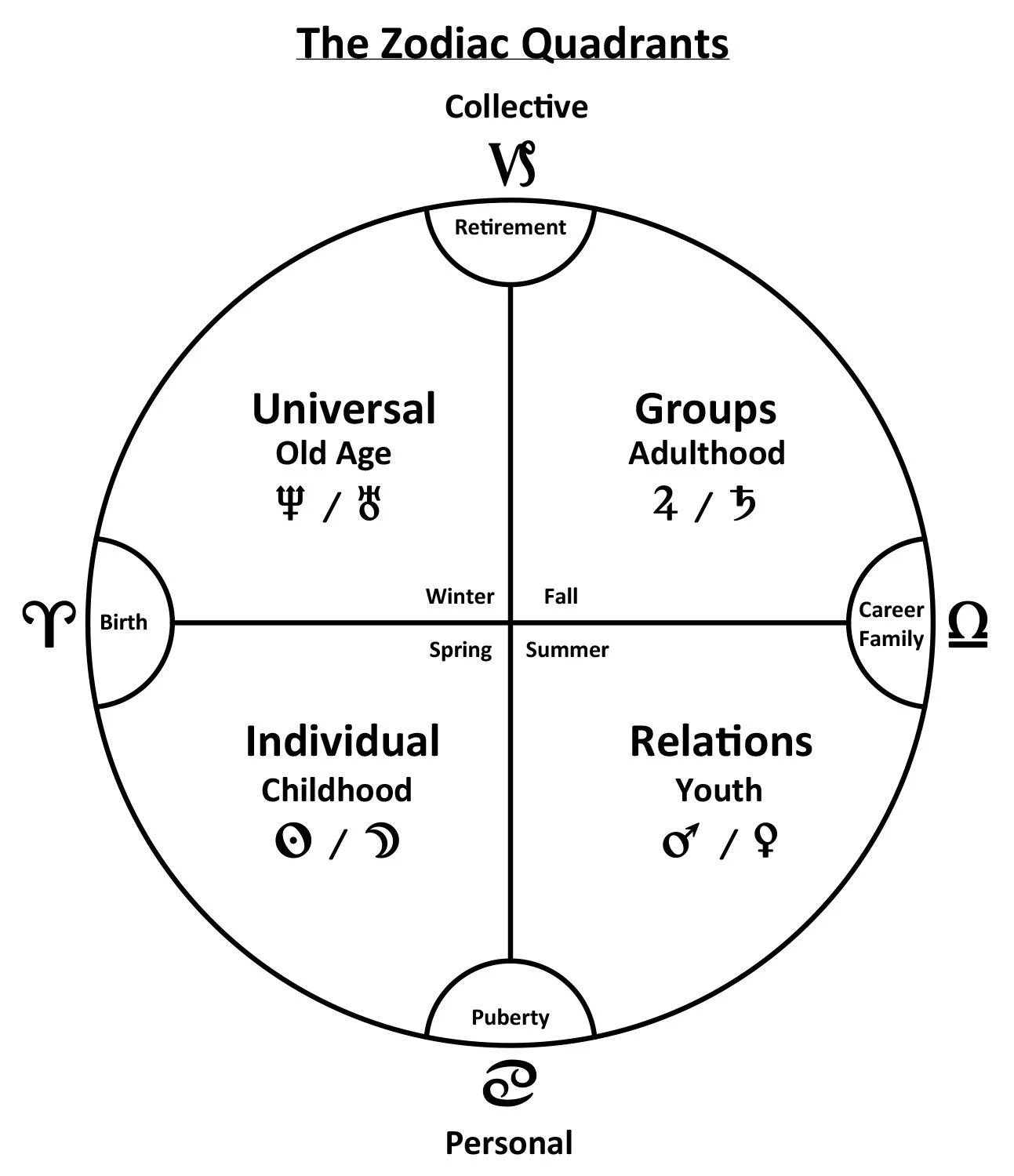 The quadrants of the zodiac, formed by the seasons, show the process of unfolding life. Out of the deep restfulness of Winter, life is born and expressed throughout the warm, extroverted seasons of Spring and Summer. Together, they form the personal hemisphere of the zodiac, which represents the individuation of beings and the first half of a human life.